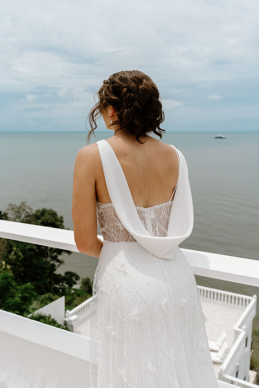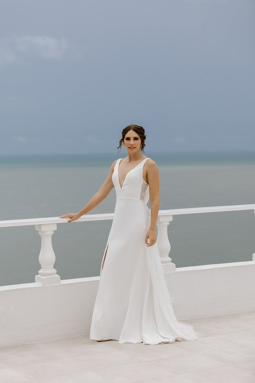 Zelia is a stunning fusion of simplicity and drama, perfect for the modern princess. With a low V-neckline and a luxurious French crepe front, Zelia radiates sleek sophistication. The back of the gown tells a different story, adorned with intricate lace and soft touches of 3D flower appliqués that add a delicate, romantic flair. A beautifully designed cowl drapes gracefully, thanks to the added fabric that ensures it hangs to perfection. Zelia is both captivating and timeless, offering brides a look thats effortlessly enchanting.